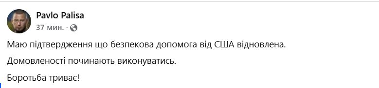 О возобновлении поставок оружия сообщил заместитель главы Офиса президента Украины Павел Палиса в своем Facebook. По его словам, достигнутые соглашения уже начинают выполняться.