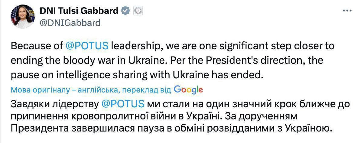 11:08 Нацразведка США возобновила обмен информацией с украинской стороной. Об этом заявила глава Нацразведки США Тулси Хаббард.