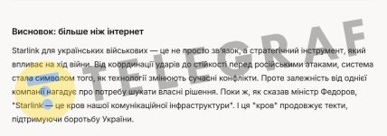 Совсем недавно Илон Маск заявлял, что "Starlink — это основа украинской армии" и если он отключит его, то "линия фронта ВСУ развалится". Хотя такие слова вызвали бурную реакцию, ИИ считает, что они подчеркивают реальность. Это связано с тем, что Украина на сегодняшний день не имеет альтернативы этой сисиетме.