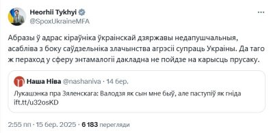 "Оскорбления в адрес главы украинского государства недопустимы, особенно со стороны соучастника преступления агрессии против Украины. Кроме того, переход в область энтомологии (науки о насекомых, — ред.) таракану точно не пойдет на пользу", — написал Тихий на белорусском языке.