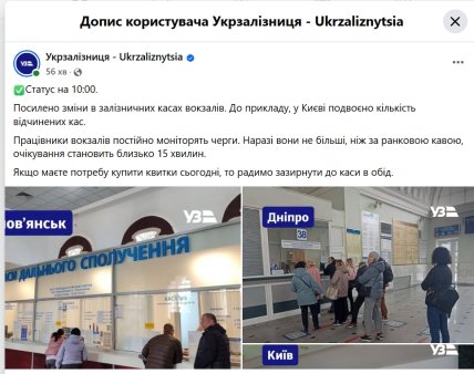 "Работники вокзалов постоянно мониторят очереди. Сейчас они не больше, чем за утренним кофе, ожидание составляет около 15 минут", — отмечают в "Укрзализныце".