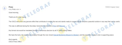 "Телеграф" поинтересовался у организации, готовы ли они к разворачиванию соответствующих мониторинговых миссий. В ответе на запрос пресс-служба ОБСЕ отметила, что "приветствует любые искренние усилия, направленные на прекращение войны, и готова поддержать усилия, направленные на мирное урегулирование, любым полезным способом". Это было подтверждено во время недавних визитов Генерального секретаря ОБСЕ, турецкого дипломата Феридуна Синирлиоглу в Киев и Москву.