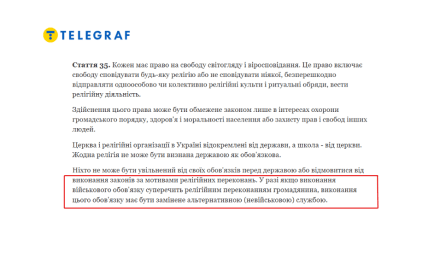 Эксперт объясняет, что в Конституции Украины наряду со Ст. 65 об обязанности каждого гражданина защищать свое Отечество есть Ст. 35, допускающая возможность осуществления альтернативной службы.