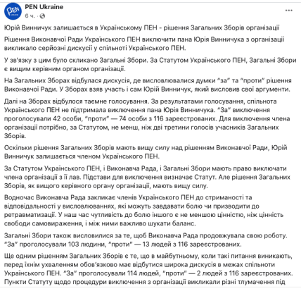 На фоне этого Исполнительный совет ПЭН принял решение исключить Винничука из организации.