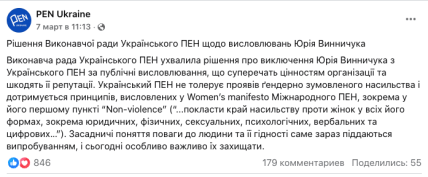 "Исполнительный Совет призывает членов Украинского ПЕН к сдержанности и ответственности в высказываниях, которые могут причинять боли или приводить к ретравматизации. В наше время чувствительность к боли другого является не меньшей ценностью, чем ценность свободы самовыражения, и между ними важно искать баланс", — подчеркнули в Украинском ПЕН.