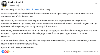 Одним из публично не согласившихся с таким решением стал Илларион Павлюк – известный украинский писатель, журналист и военный. Он подал заявление о выходе из ПЭН, отметив, что эта ситуация показала несовпадение во взглядах на роль организации.