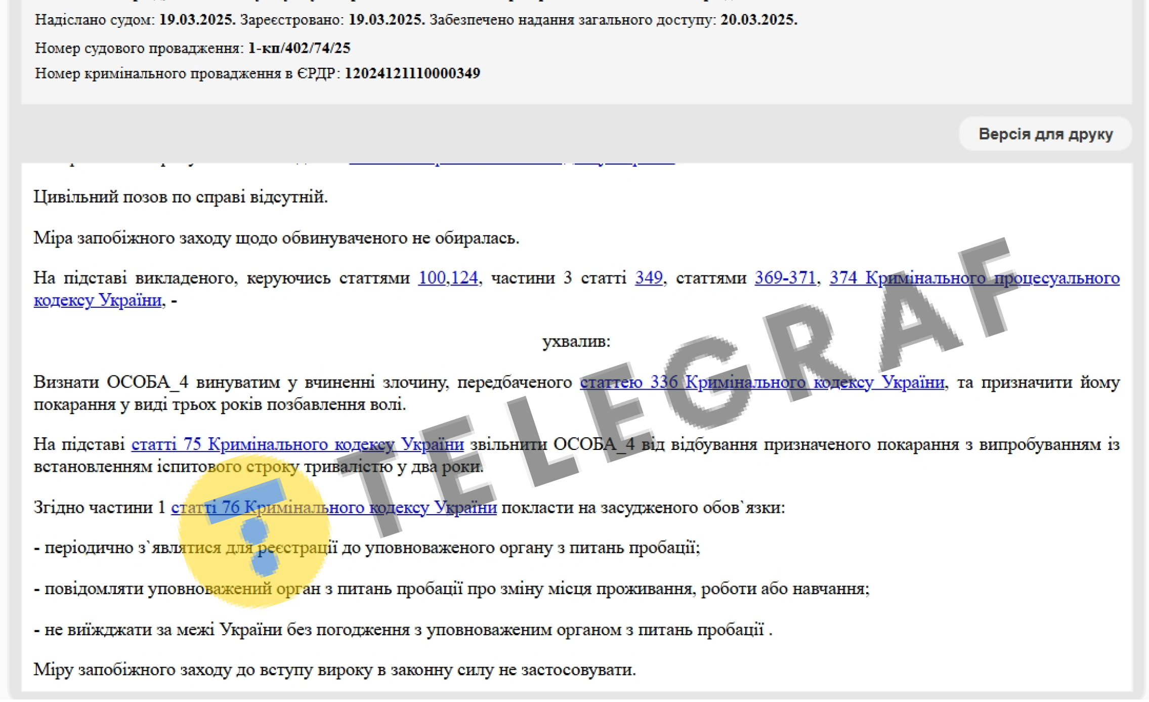 Суд, учитывая все обстоятельства дела, признал военнообязанного виновным в совершении уголовного правонарушения, предусмотренного статьей 336 Уголовного кодекса Украины (уклонение от призыва на военную службу во время мобилизации на особый период). Ему назначили наказание в виде трех лет лишения свободы.