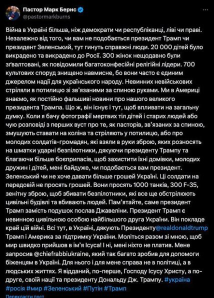 Духовный советник президента США Дональда Трампа Марк Бернс посетил Бучу, Бородянку и Ирпень, после чего обнародовал сильное послание. В нем он отметил, что Украина нуждается в оружии.