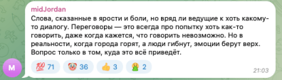 - "Слова, сказанные в ярости и боли, но вряд ли ведут к любому диалогу… Когда города горят, а люди гибнут, эмоции одерживают верх. Вопрос только в том, куда это все приведет."