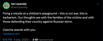 Министр иностранных дел Чехии Ян Липовский заявил, что удар по детской площадке — это не война, а варварство: