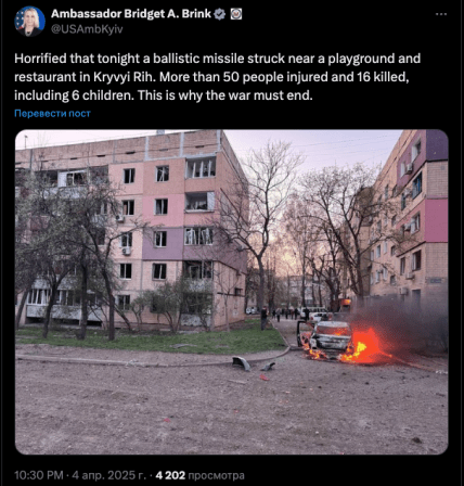 Посолка США Бринк также осудила удар по Кривому Рогу, но не указала, кто именно убил детей.