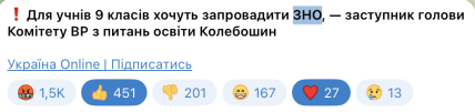 "Я хочу сообщить, что это неправда. Я такого не заявлял. Никто не собирается вводить ВНО после 9 класс , тем более во время военного положения. Сейчас мы проводим только НМТ для тех учеников, которые хотят поступать в вузы. Однако это все вызывает волну хейта", — говорит Колебошин.