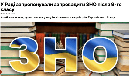 Информация о том, что в Украине хотят внедрить ВНО для учащихся 9 классов, не правдива. Слова заместителя председателя Комитета Верховной Рады Украины по вопросам образования, науки и инноваций Сергея Колебошина были вырваны из контекста и извращены.