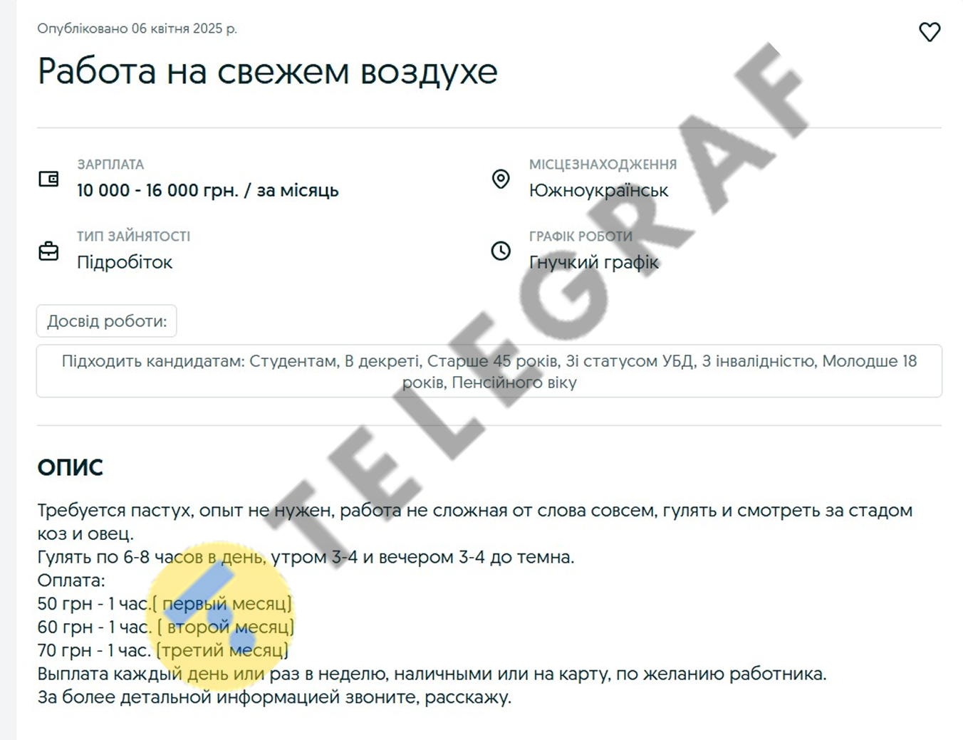 Соответствующее объявление появилось на сайте, где предлагают работу. Там отмечается, что хозяйство в Южноукраинске ищет пастуха для ухода за стадом коз и овец.