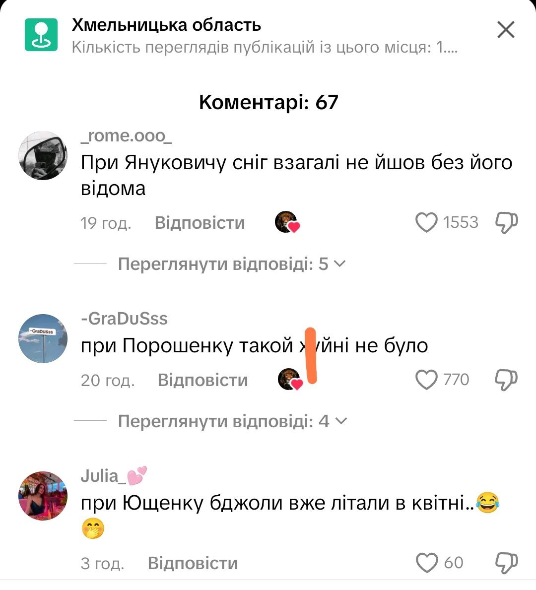 Украинцы упомянули в своих видео бывшего президента Украины Виктора Януковича. Под звук с его голосом пользователи Тика Тока записали снег, который виден на зеленой траве.