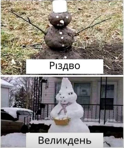 Также украинцы шутили и о том, что на Рождество снега не было, сверху на фото представлена снежная баба из грязи. А фото снизу показывает, что перед Пасхой выпал снег. Поэтому вместо снежной бабы – кролик.