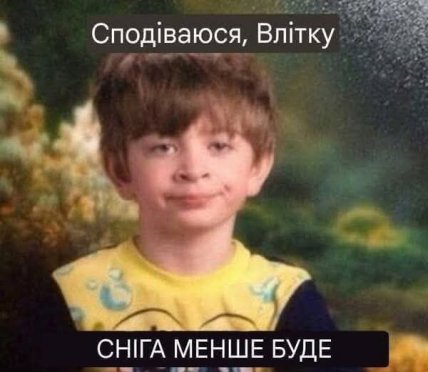Еще один мем создали наши несокрушимые люди о комичности ситуации с погодой в апреле. На фото изображен ребенок в желтой футболке, кторый делает характерное выражение лица, оно передает определенную наивную надежду. Текст шутки подписан так: "Надеюсь, летом снега меньше будет".