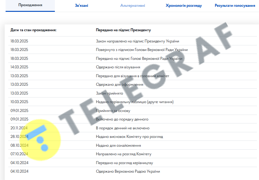 Этот законопроект Верховная Рада Украины приняла во втором чтении 13 марта 2025. Тогда 240 депутатов проголосовали "за". 14 апреля о подписании сообщила заместитель министра обороны Екатерина Черногоренко на своей странице в Facebook. Однако на сайте Верховной Рады последняя информация лишь о том, что закон направлен на подпись президенту Украины.