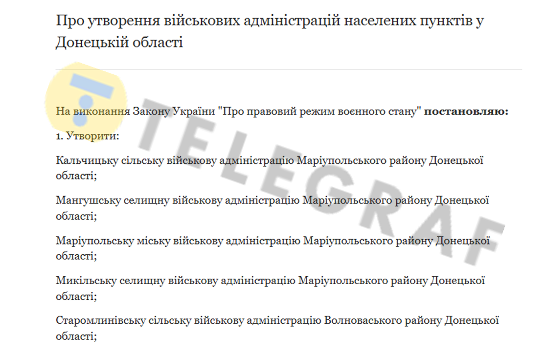 Как сообщается на сайте Офиса президента, всего в Донецкой области создано десять новых военных администраций. В Мариупольском районе появились администрации в Кальчицкой, Мангусской, Мариупольской, Никольской и Сартанской общинах. В Волновахском районе — в Старомлиновской, Хлебодаровской, Волновахской, Мирненской и Ольгинской. Все упомянутые населенные пункты остаются под оккупацией с 2022 года.