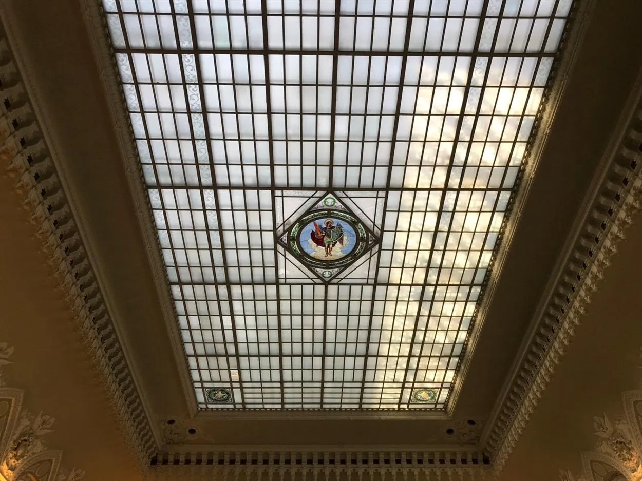 За парадными дверями скрываются интерьеры, поражающие роскошью художественного оформления, созданного талантливым итальянским скульптором Элио Саля. Операционный зал банка украшен виртуозной лепниной, скульптурными изображениями античных божеств, красочными витражами и впечатляющим изображением Архангела Михаила – небесного покровителя Киева.