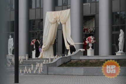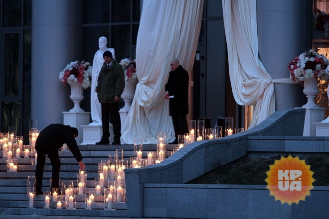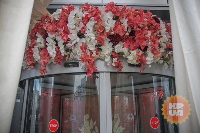 Лестница в отеле была украшена свечами, что создавало романтическую атмосферу. Вход у помещения был украшен цветочными букетами и скульптурами. Охрана тщательно проверяла гостей по списку приглашенных.