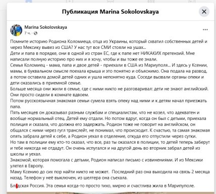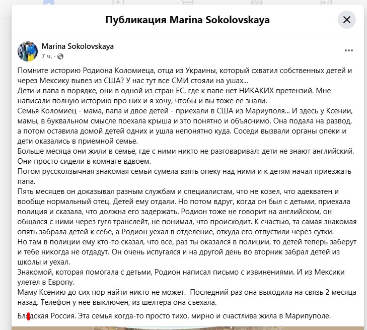 По словам женщины, семья Коломиец – мама, папа и двое детей – приехали в США из Мариуполя. Соколовская пишет, что потом у Ксении (матери) начались проблемы.