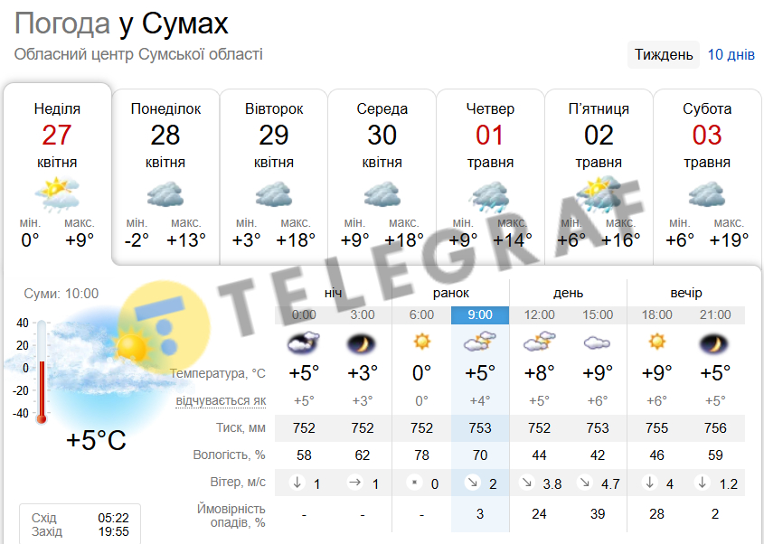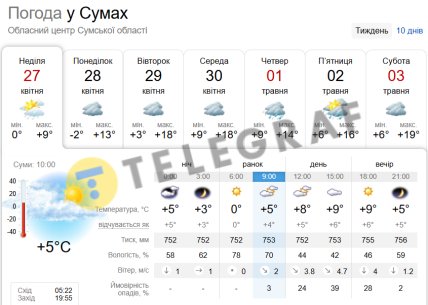 Скриншот прогноза погоды в Сумах на 27 апреля.