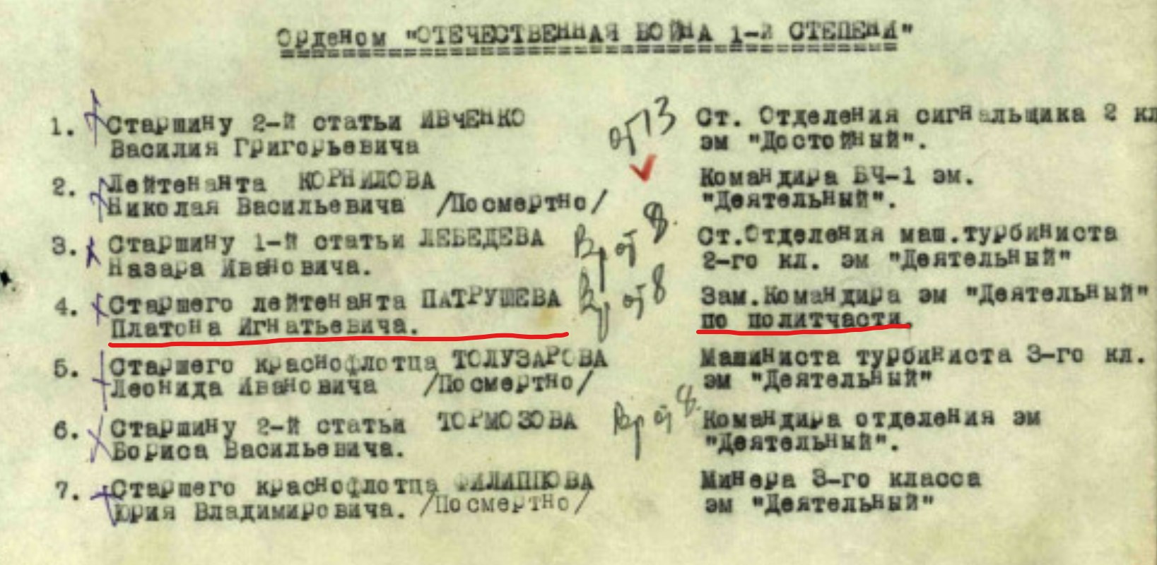 Сам Платон Патрушев чудом выжил только потому, что в момент трагедии находился на берегу, получив разрешение на поездку в Ленинград. Как отмечает Золотухин, это разрешение ему предоставил украинский морской офицер Константин Кравченко, уроженец Гомельского района Беларуси.