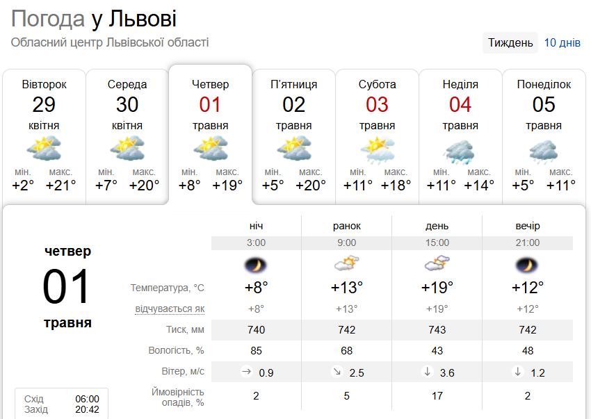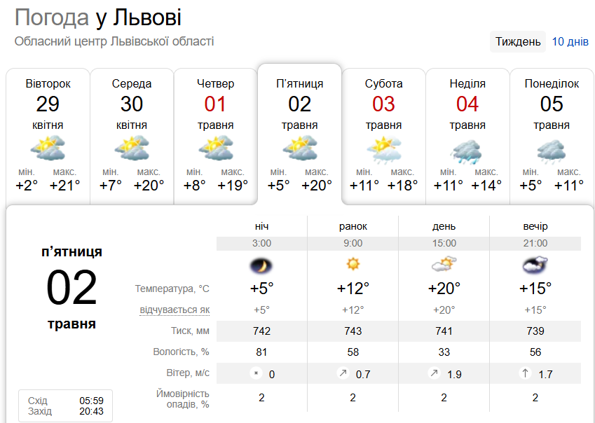 2 мая. В четверг утром Львов встретит солнечную погоду и к обеду небо будет ясным. Уже после 15:00 могут появиться облака, однако осадков синоптики не обещают. Температура воздуха вырастет от +5 градусов ночью и +20 — днем. Атмосферное давление будет держаться на уровне 739-743 мм рт. ст., а ветер в течение суток будет слабым – до 2 м/с.