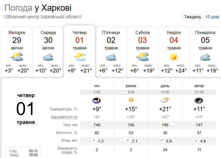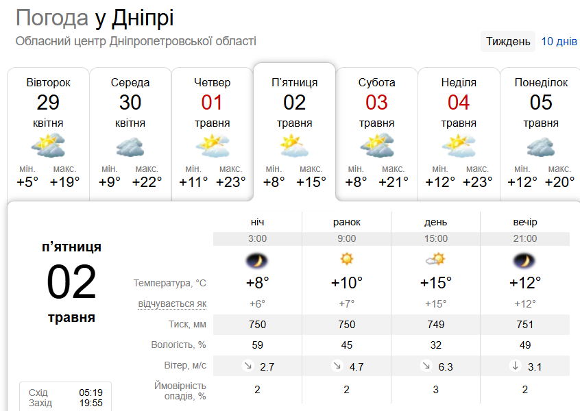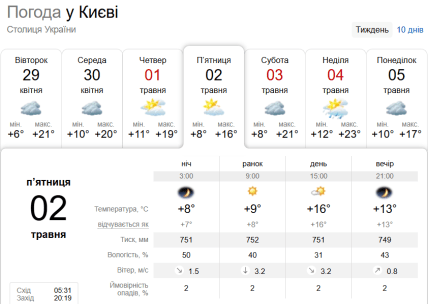 2 мая. В ночь на четверг температура опустится до +6 градусов, а максимальная дневная температура достигнет отметки +12. Атмосферное давление вырастет до 750 мм рт. ст. Однако в течение дня в Харькове будет достаточно ветрено — скорость будет достигать 5,7 м/с днем. Хотя ночь обещает быть ясной, уже с утра до вечера в городе сохранится плотная облачность. Осадков не прогнозируется.