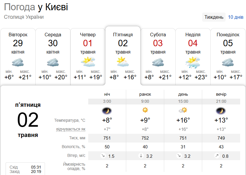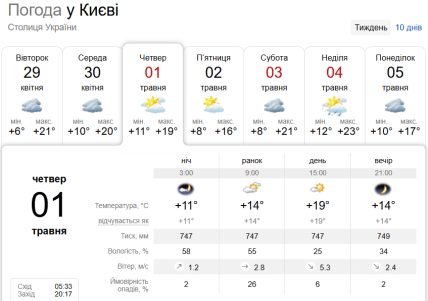 1 мая. На День труда утро в столице начнется с пасмурного неба, но уже к обеду облака исчезнут и остаток дня будет солнечным. Столбики термометров покажут от +11 градусов ночью, до +19 — днем. Давление будет держаться на уровне 747-749 мм рт. ст., ветер усилится до 5,3 м/с днем, а вероятность осадков составит 26% максимум.
