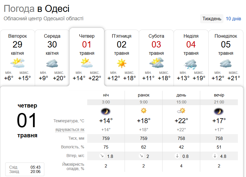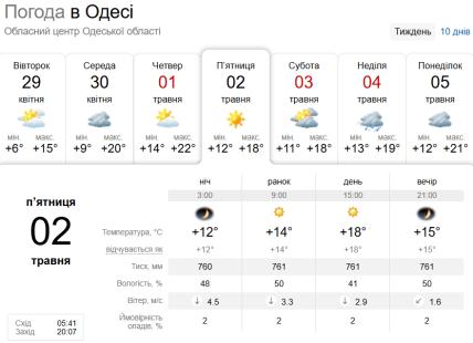 2 мая. В четверг синоптики также обещают одесситам безоблачное небо весь день. Температура ночью опустится до +12 градусов, а днем достигнет +18. Атмосферное давление повысится до 761 мм рт. ст., что свидетельствует о стабильных погодных условиях. Ветер будет несколько с порывами — 1,6-4,5 м/с.