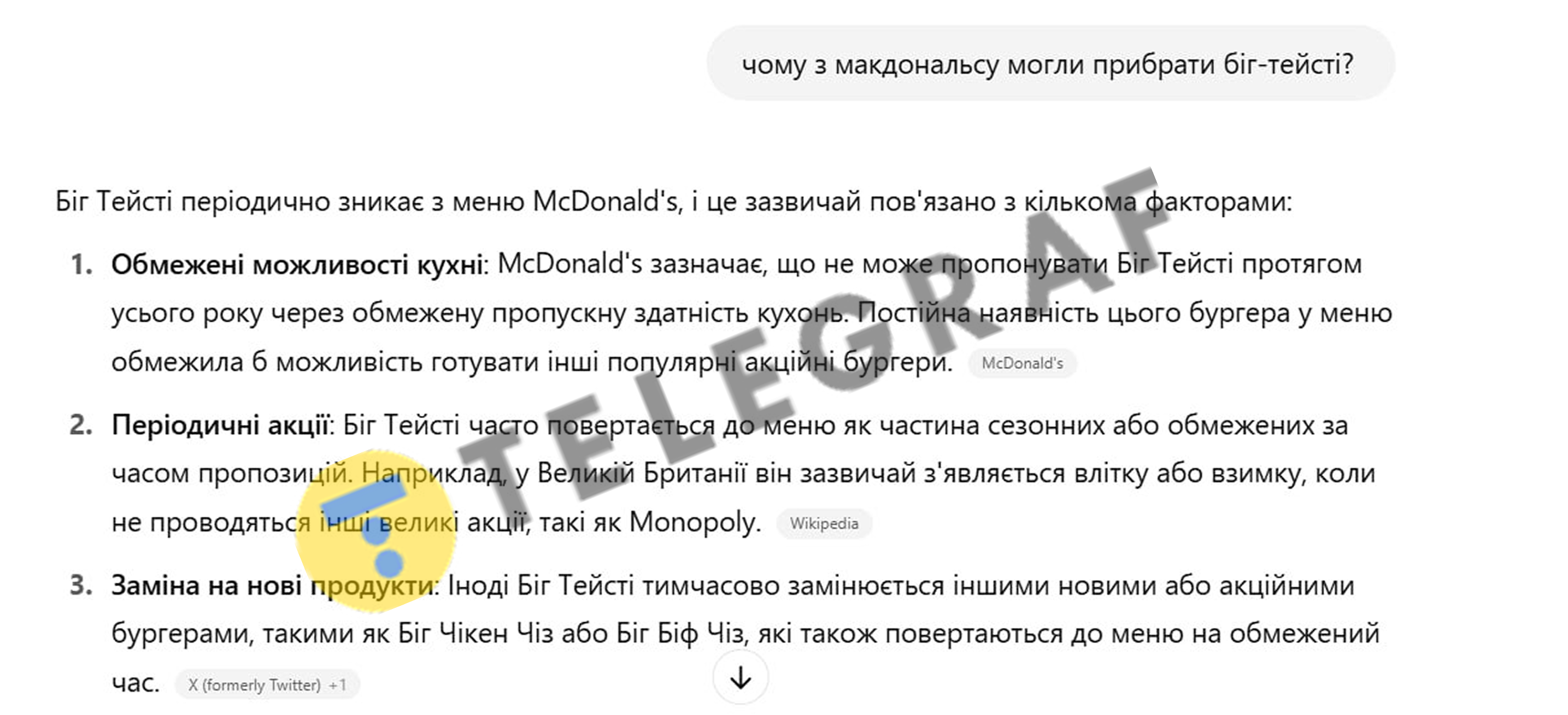 "Телеграф" обратился к нейросети, чтобы узнать, почему из меню могли убрать Биг Тейсти. Отмечается, что такое периодически происходит.