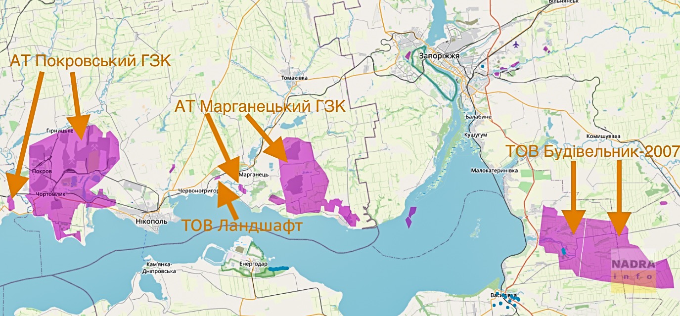 Балансовые запасы руд марганца учитываются на территории Запорожской, Днепропетровской и Херсонской областей.
