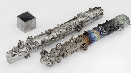 22. Гафний – очень редкий переходный металл, который является постоянной примесью в цирконе. В большинстве циркониевых минералов есть от 1-2 до 6-7 % гафния, а во вторичных минералах — до 35 %. Он используется для производства регулировочных стержней для ядерных реакторов на атомных электростанциях и подводных лодках, а также защитных экранов. Небольшие примеси гафния (1-2 %) значительно улучшают устойчивость металлов к температуре и давлению, поэтому его добавляют в сплавы, используемые для лопастей турбин реактивных самолетов, сопел и других деталей ракет и т. д.