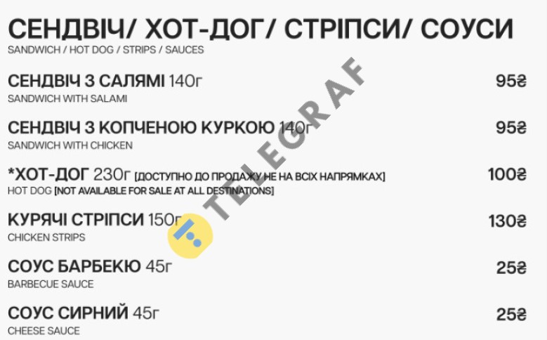 Для легкого перекуса пассажиры могут приобрести сэндвич с салями за 95 гривен, а сэндвич с курицей обойдется в 100 гривен. Есть также куриные стрипсы за 130 гривен, к которым можно добавить барбекю или творожный соус за 25 гривен каждый.