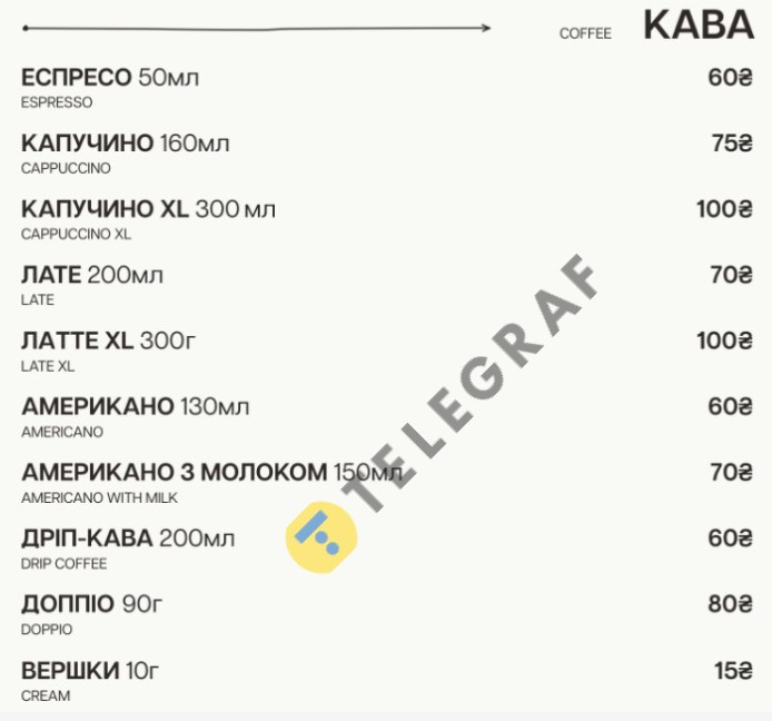Эспрессо стоит 60 гривен, американо – также 60 гривен, а американо с молоком – 70 гривен. Капучино можно приобрести за 75 гривен, а латое – за 70 гривен. Для любителей больших порций доступны XL-варианты: латое XL за 100 гривен и капучино XL также за 100 гривен.