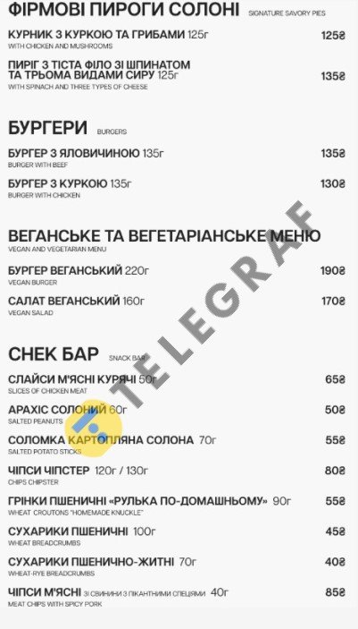"Укрзалізниця" позаботилась и о вегетарианцах — в меню есть веганский бургер за 190 гривен и веганский салат за 170 гривен. Также есть пироги с разными начинками – с курицей и грибами за 125 гривен или со шпинатом и тремя видами сыра за 135 гривен.