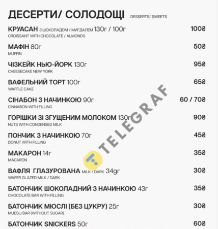 Ассортимент десертов таков: круассан с шоколадом или миндалем за 100 гривен, чизкейк "Нью-Йорк" за 95 гривен и вафельный торт за 65 гривен. Также предлагаются мафины за 50 гривен, донаты с начинкой за 45 гривен и другие сладости.
