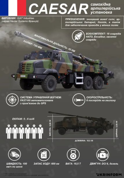 САУ CAESAR – французская 155-мм самоходная артиллерийская установка. Дальность стрельбы – 40 км. Может отстрелять до 6-8 снарядов в минуту при работе в обычном режиме. По шоссе едет в среднем 80 км/ч. Кабина бронированная. САУ оснащена полуавтоматической системой подачи снарядов, что повышает скорость и снижает опасность экипажа. Чтобы развернуть САУ в боевое положение, нужно всего 60 секунд, а для свертывания — 40 секунд. Это позволяет быстро "отстреляться" и уехать.