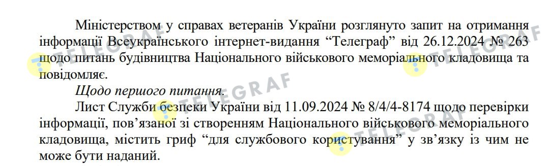 Относительно возможного участия Ермолаева в проекте НВМК даже проводилась проверка СБУ, но ее результаты журналистам предоставлять отказываются. Так, "Телеграф" в свое время посылал запрос в Минветеранов, по заказу которого Служба безопасности и проводила проверку, с просьбой предоставить ответ СБУ по поводу ее результатов или хотя бы выводы по этому ответу. Но в министерстве отметили, что "письмо Службы безопасности Украины от 11.09.2024 № 8/4/4-8174 о проверке информации, связанной с созданием Национального военного мемориального кладбища, содержит гриф "для служебного пользования", в связи с чем не может быть предоставлено".