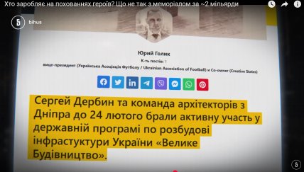 Так, авторы расследования обратили внимание, что архитектор Сергей Дербин, уже упомянутый "победитель" тендера с одним участником по эскизному проекту НВМК, имел отношение к "куратору" "Большого строительства" Юрию Голику и Георгию Биркадзе (известен в связи со сливом на Голика информации из НАБУ). Так, Биркадзе выступал якобы советником проекта НВМК и ездил с Дербиным за границу "перенимать опыт" строительства кладбищ. При этом с Голиком Дербин ранее активно работал по программе "Большое строительство", а в телефоне Голика нашли рендеры визуализации НВМК, сброшенные ему в личку еще в 2023 году.