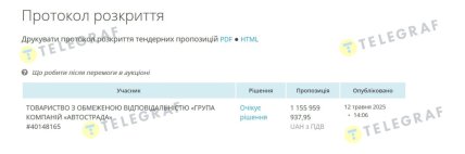 Пока это предварительная информация, предложение от "Автострады" имеет статус "ожидает решения". Другие два участника – ООО "Строительная фирма ПАРИТЕТБУДИНВЕСТ" и ООО "Строительная фирма ПРЕМИУМСТАНДАРТБУД" предложили 1,211 и 1,316 млрд грн соответственно.