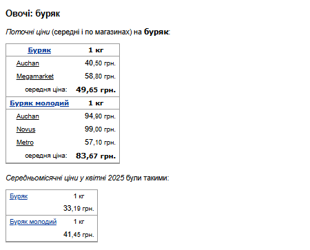 Стоит отметить, что еще месяцем ранее, в апреле, стоимость килограмма свеклы составляла 33,19 грн, а молодой свеклы — 41,45 грн.