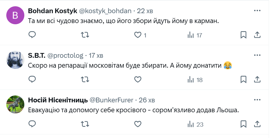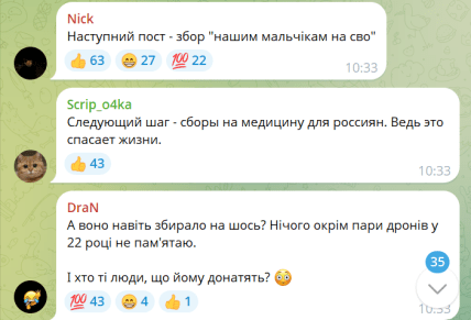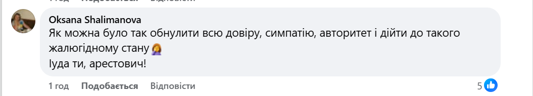 "Как жестко Алексея из Кремля нагнули", "Лешу от санкций немного понесло не в ту сторону, а скорее в сторону рашки", "Следующий пост — сбор "нашим мальчикам на сво", "Следующий шаг — сбор на медицину для россиян. Ведь это спасает жизнь", "Соберите на медицину себе, вам уже необходимо пройти обследование по потере совести", "Да мы все прекрасно знаем, что его сборы идут ему в карман", "Как можно было так обнулить все доверие, симпатию, авторитет и дойти до такого плачевного состояния. Иуда ты, Арестович!", — пишут в сети.