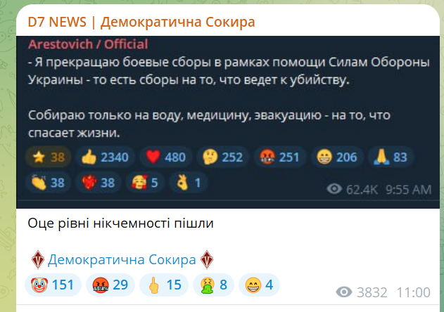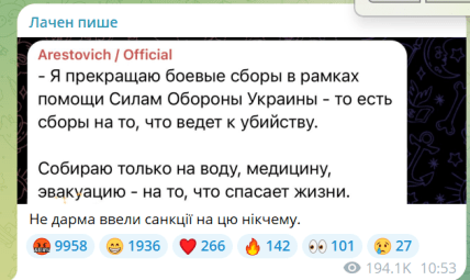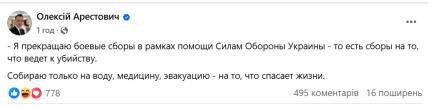 "Я прекращаю боевые сборы в рамках помощи Силам Обороны Украины — то есть сборы на то, что ведет к убийству. Собираю только на воду, медицину, эвакуацию — на то, что спасает жизни", — написал бывший советник Офиса президента на своей Facebook-странице.