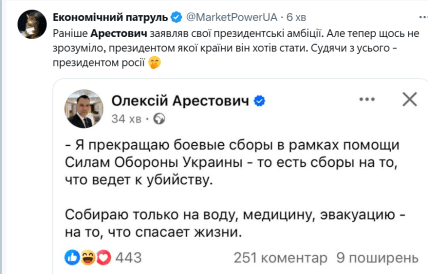 Комментаторы высказывают предположение, что это решение Арестович принял под давлением Кремля. Также есть мнение, что он обиделся за санкции. Пишут, что его следующим шагом будут сборы для российской армии.
