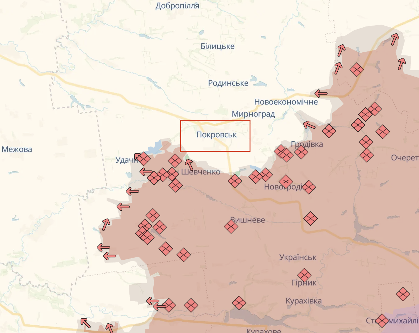 Во-вторых, Россия не ослабила давление южнее Покровска – в районе села Шевченко и продолжает штурмовать юго-западнее города – в районе Новоалександровки, Котляровки и Троицкого. Эти села расположены перед админграницей с Днепропетровщиной, и именно этот участок сейчас наиболее чувствительный.