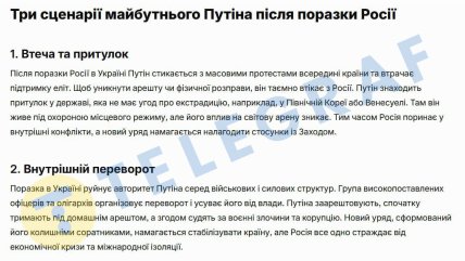 По мнению ИИ, после поражения России в войне в стране начнутся массовые протесты. А это в свою очередь будет способствовать потере поддержки элитой. Учитывая это, чтобы избежать ареста или физической расправы, Путин, скорее всего, бежит с России. Он будет искать убежище в государстве, где нет соглашения об экстрадиции, например, в Северной Корее или Венесуэле. Там он может дожить свои годы под охраной, но его влияние на мировую политику исчезнет. А Россия в это время переживет тяжелые времена внутренних конфликтов, которые создадут новое правительство с проевропейским взглядом.