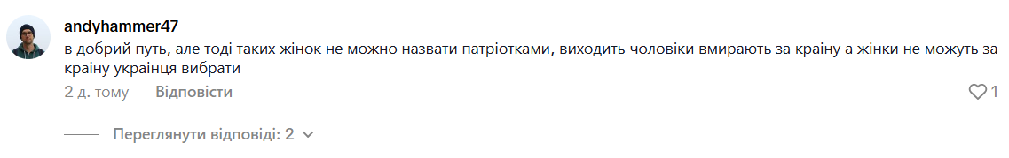 Некоторые высказали более жесткую позицию: "В добрый путь, но тогда таких женщин нельзя назвать патриотками. Выходит, мужчины умирают за страну, а женщины не могут за страну украинца выбрать".